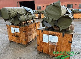 Ca. 585 stk. bæger til feltflaske, ca. 1300 stk. lygte, PRECOR træningscykel og en palle med diverse vest dele og lommer