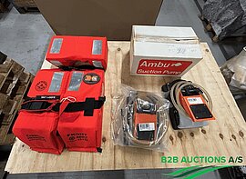 Diverse materiel: lamper, heldragt, plastikkasser, plastgulv, rygsæk m.m.