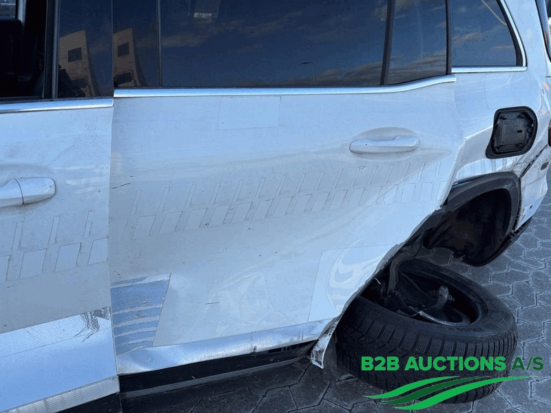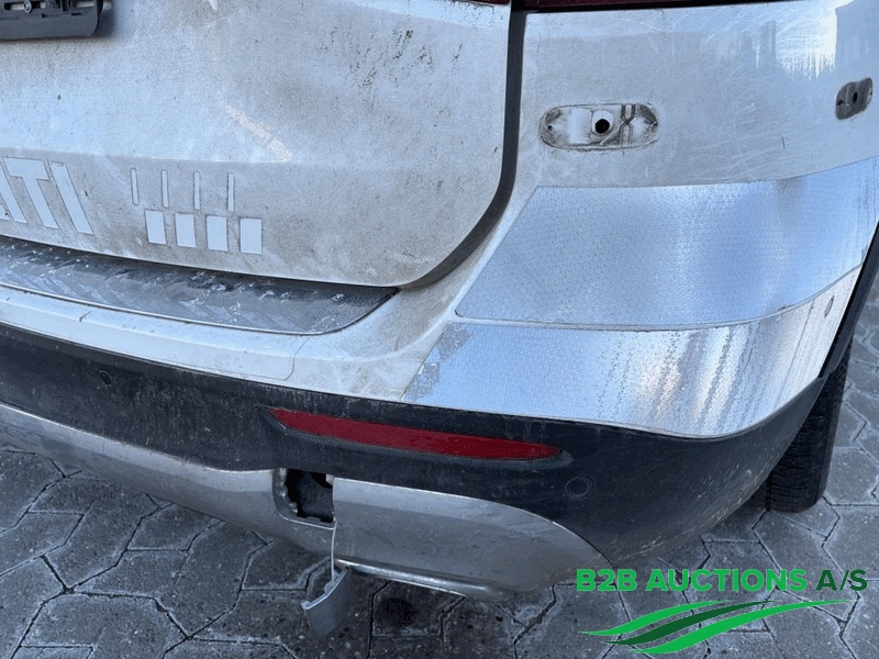 Skade på venstre bagdør, bagskærm, fælge og bagerste kofanger.